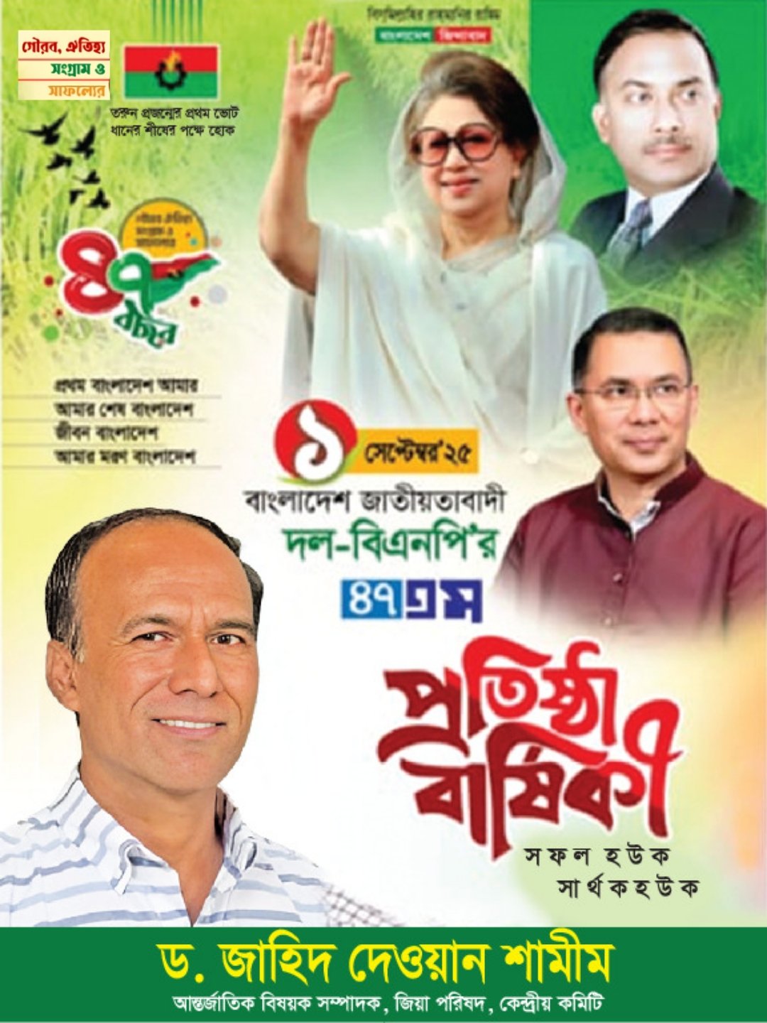 এই প্রতিষ্ঠাবার্ষিকীর শুভক্ষণে আমি আপনাদের সকলকে আহ্বান জানাই—ঐক্যবদ্ধ হয়ে দলকে আরো শক্তিশালী ও গতিশীল করার জন্য। দেড় দশক পর দেশে গণতন্ত্র পুনরুদ্ধারের যে নতুন দিগন্ত উন্মোচিত হয়েছে, সেটিকে স্থায়ী ও প্রাতিষ্ঠানিক রূপ দিতে আমাদের সবাইকে একযোগে কাজ করতে হবে।