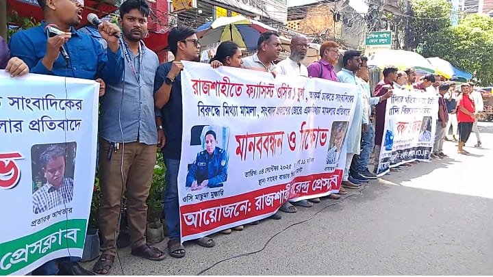 রাজশাহীতে সাংবাদিকদের বিরুদ্ধে মিথ্যা মামলা: ওসির অপসারণের দাবিতে মানববন্ধন
