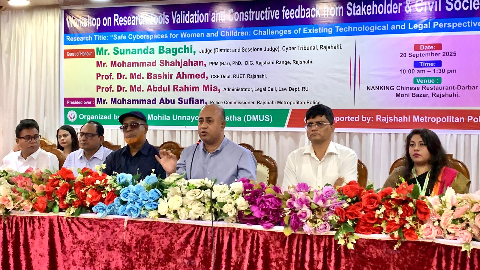 শনিবার (২০ সেপ্টেম্বর) সকালে নগরীর মনিবাজার নানকিং দরবার হলে “নারী ও শিশুদের জন্য নিরাপদ সাইবারস্পেস: বিদ্যমান প্রযুক্তিগত ও আইনি দৃষ্টিভঙ্গির চ্যালেঞ্জ” শীর্ষক এ কর্মশালার আয়োজন করে দোলা মহিলা উন্নয়ন সংস্থা (ডিএমইউএস)। সহযোগিতা করে রাজশাহী মেট্রোপলিটন পুলিশ (আরএমপি)।